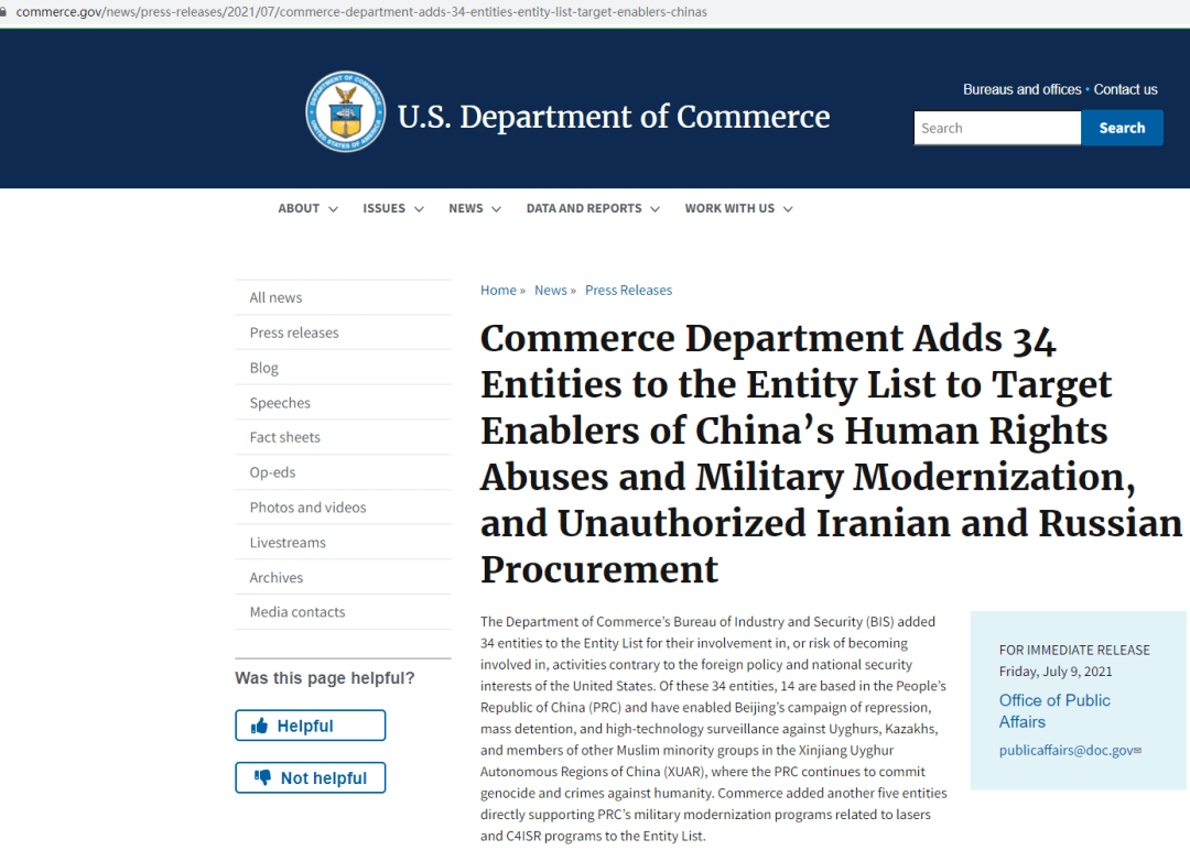 ERC認(rèn)定以下實(shí)體與所謂“中國(guó)在新疆的侵犯人權(quán)行動(dòng)”有牽連,違反美國(guó)外交政策,將其列入“實(shí)體清單”。